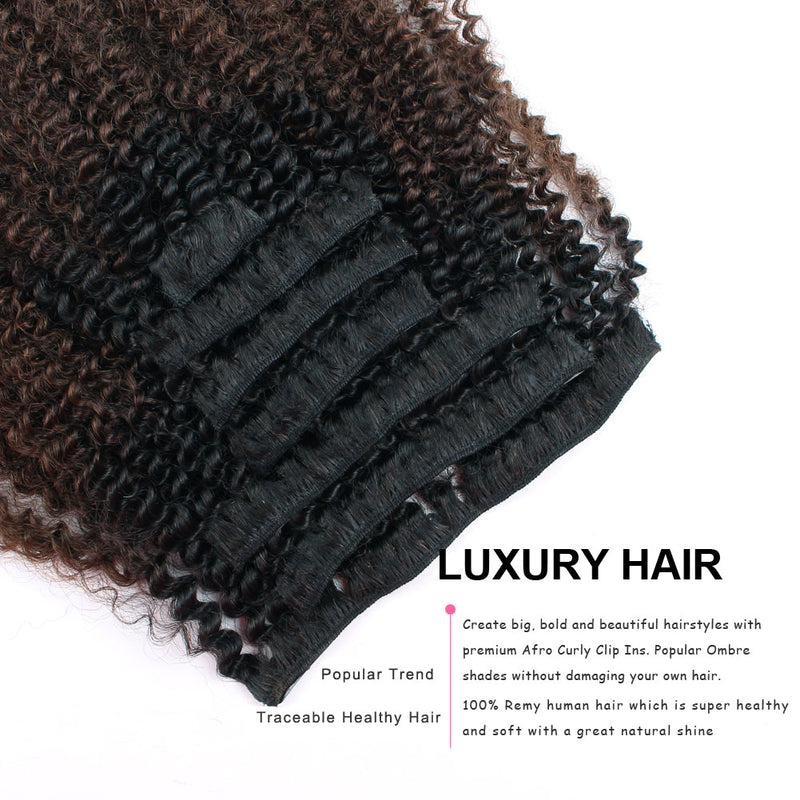AmazingBeauty Big Afro Kinkys Curly Ombre Clip Ins Extensions Real Remy Human Hair for African American, Natural Black Color Fading Into Chocolate Brown. This Beautiful Two Tone Color Hair Will Bring You Shiny Color Without Dying Your Own Natural Hair. Afro Curly Can Blend Best with 3C or 4A Textures.